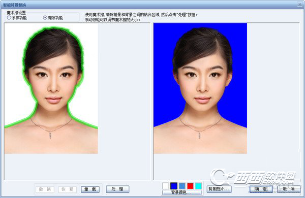 2、然后就是对照背景替换,只要点击“背景处理”,软件就会自动分离前景和背景,选择一种颜色即可很简单的就完成照背景的替换。
