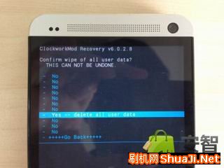 3.音量键选择“yes--删除全部用户数据” ,点击电源键 确认