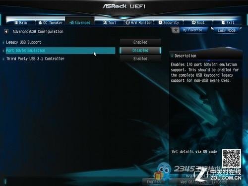 以华擎的Z170主板为例. 进入BIOS界面后,进入Advanced菜单,您将看到USB Configuration选项,其中包含USB接口的相关设置. 其中,“端口60/64仿真”选项与Win7安装界面中的USB接口切换选项有关. 从屏幕截图中可以看到,此选项默认情况下处于关闭状态. 我们只需要打开并保存项目,就可以在Win7中使用它. 安装界面中通常会使用各种USB设备.