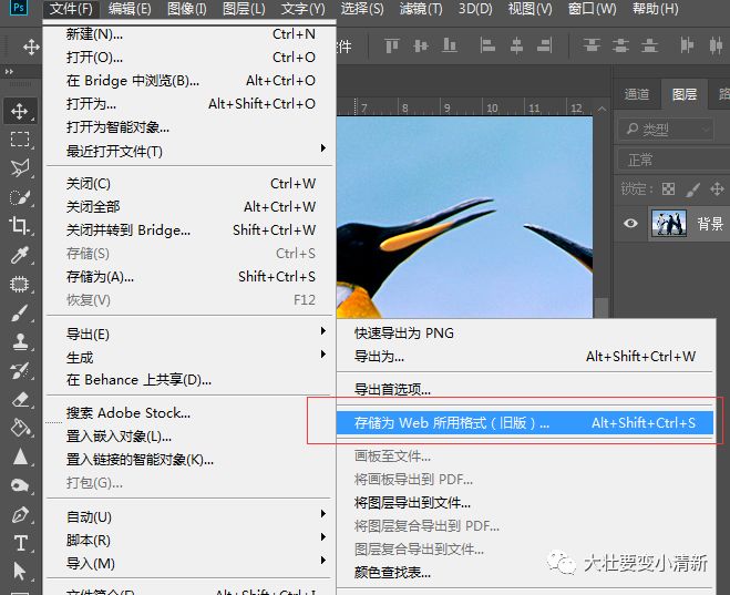 02. 在菜单栏中的“文件”中,选择“另存为Web和设备格式”(Photoshop CC版本在导出下拉菜单中).