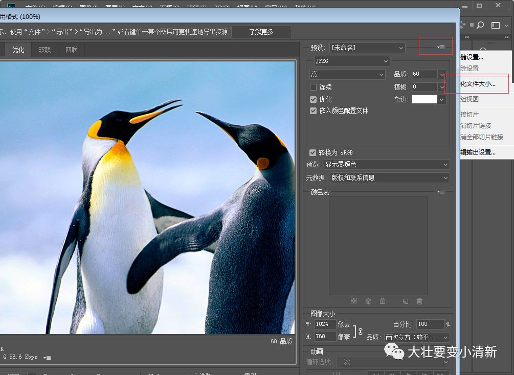 03. 在打开的对话框中,单击右侧的小三角形菜单,然后选择“优化文件大小”.