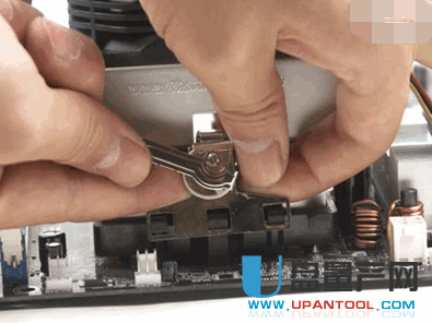 3. 卸下CPU风扇时,请先将金属夹向上拉到另一端.
