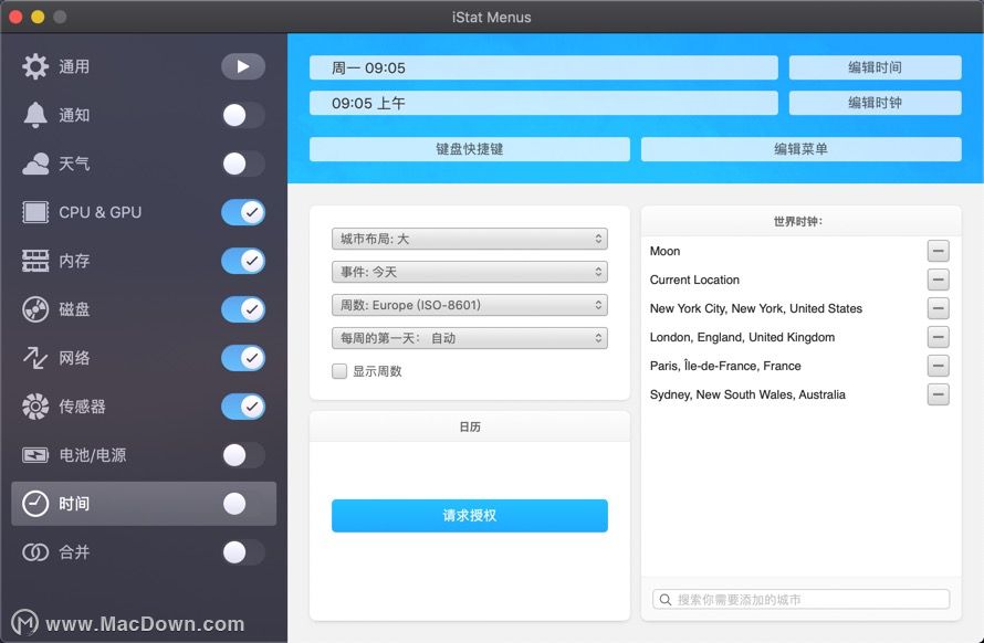 高度可定制的菜单栏时钟,日历和即将发生的事件,带有详细太阳和月亮信息的世界时钟.