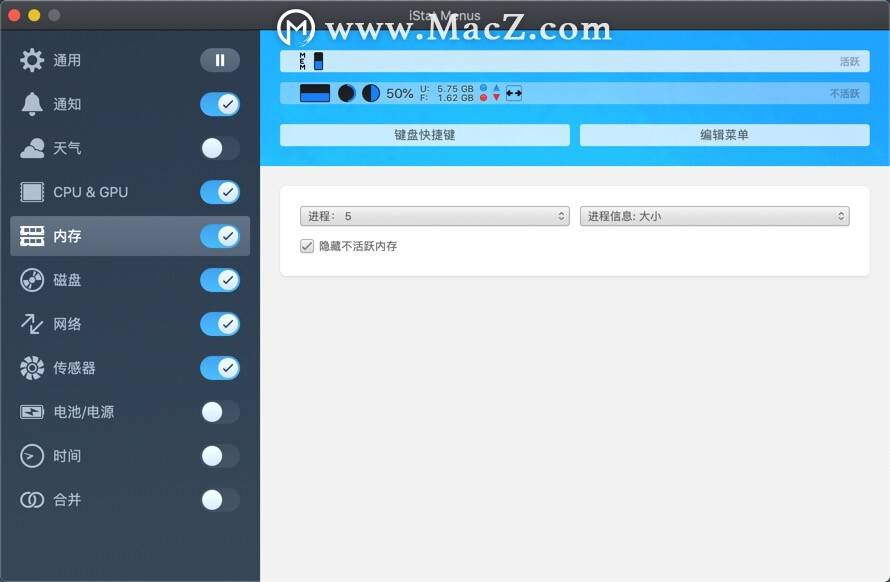Mac系统右上角的菜单界面可以显示某些后台运行程序的状态以及Mac系统的某些更新,但是您是否认为这些功能仍然有些不足,适用于Mac的iStat菜单可以使您的菜单栏变得更强大. 这是Mac系统上出色的系统监视器. 它可以在系统菜单栏中实时监视CPU,GPU,内存,硬盘,网络,温度,电池和系统时间,这样您就可以始终了解Mac在计算机上发生的各种事情. 同时,在新版本中,您还可以自由设置iStat菜单显示的信息,将您关心的系统信息放在顶部或删除您不想看到的信息,以便该软件可以充满您的个人风格.