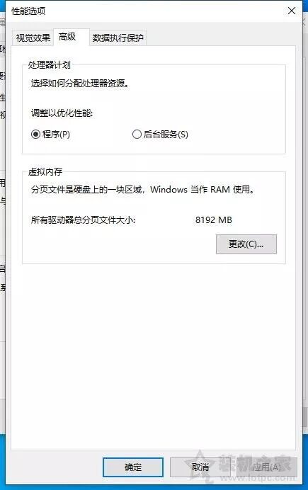 在性能选项界面中,我们切换到“高级”标签,然后单击“更改”按钮.