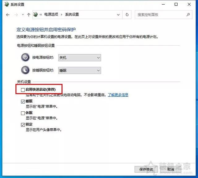 在关机设置中删除“启用快速启动(推荐)”前面的复选框.