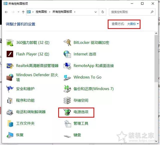 首先,我们打开控制面板,将查看方法修改为“大图标”,然后单击“电源选项”,如下图所示.