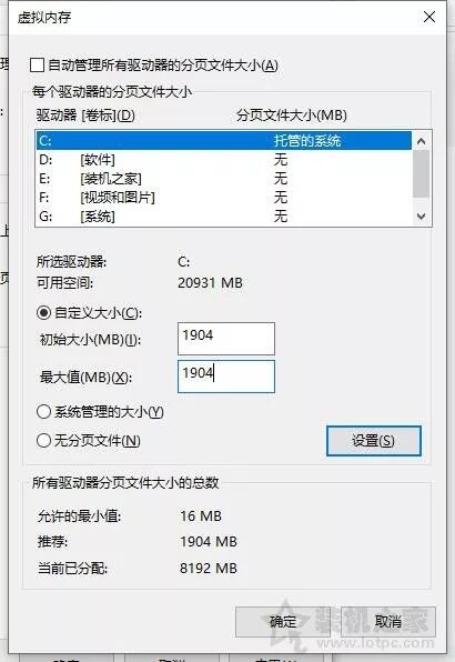 最后,找到C驱动器系统磁盘,在底部有一个推荐设置,选择自定义大小,然后在两个框中填写推荐的设置值,然后单击“设置”. 或者您的内存为8G,初始内存可以写入8000M,最大内存为16000M(物理内存的2倍).