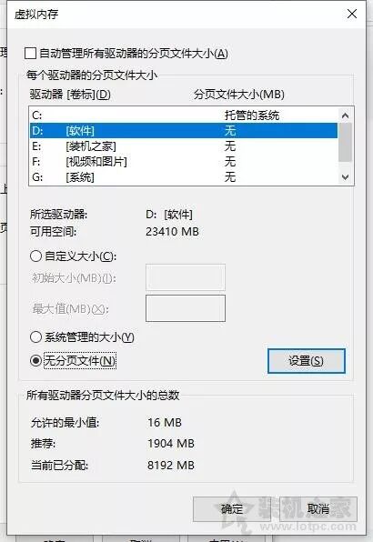 取消选中“自动管理所有驱动器的页面大小”,然后按以下顺序选择磁盘,将磁盘设置为“无页面大小”,然后单击“设置”. 除了系统磁盘,它是C驱动器,所有其他驱动器号都已重新设置.