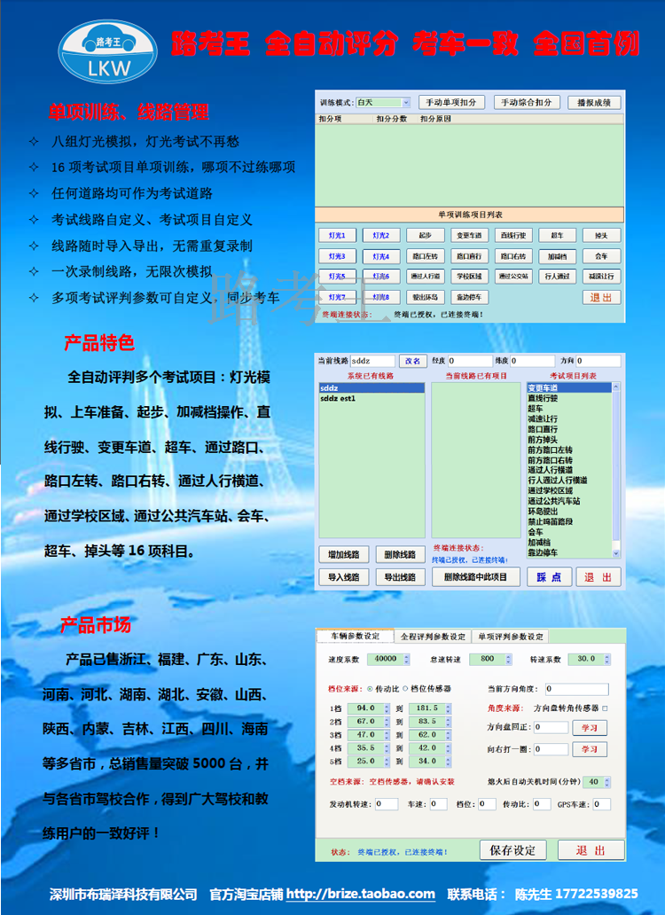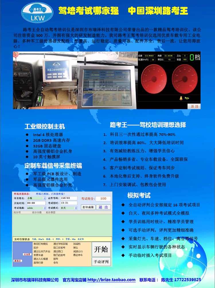 3.依托深圳总部强大的研发能力,系统软件终身免费升级,时刻与当地车管所考试内容保持同步一致,相对于其他路考仪,本产品承诺提供终身软件无限次数升级;另可提供培训、安装、维修服务。