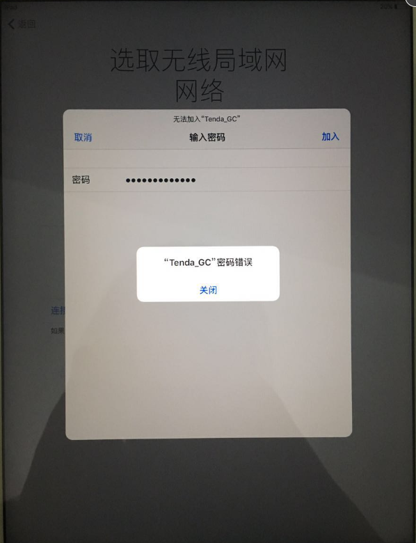 在百度上搜了“ipad air2连接不上WiFi”,上面提供过的办法全都试过,依然不能解决,最后放大招决定删掉所有APP、照片、音乐去恢复出厂设置,然而悲剧就在此时发生了,当大苹果下面的进度条走完后,出现Hello,按照指引下一步下一步到了连接无线,怀着忐忑的心输入WiFi密码,依然提示密码错误......
