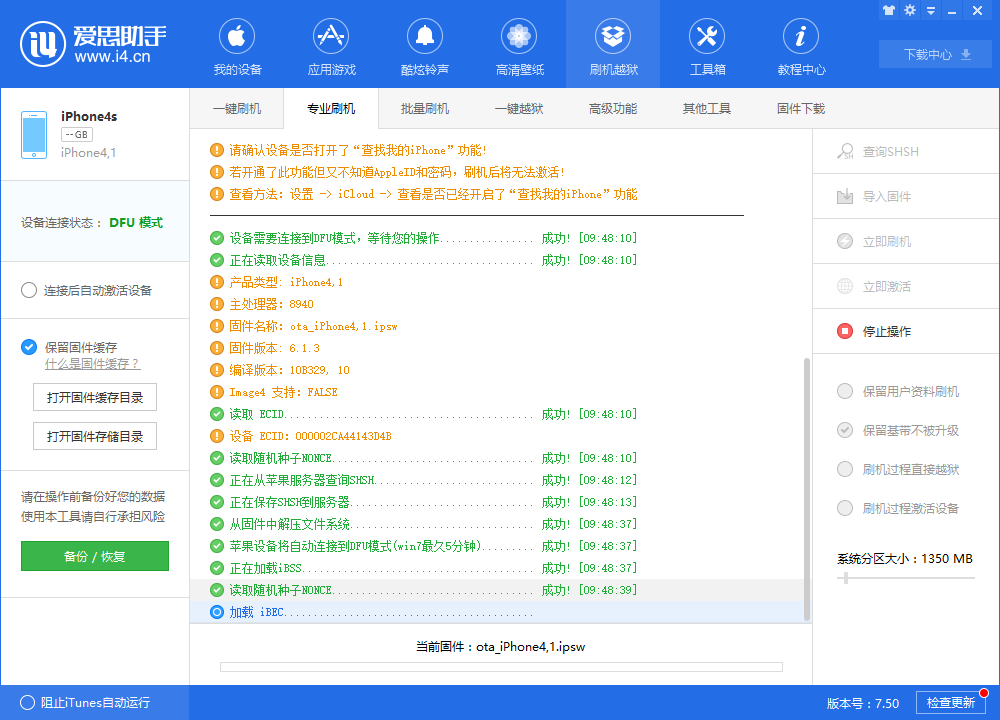 2. 进入KDFU模式后,打开Aisi Assistant并重新连接,单击以进入“ Jail Flashing-> Professional Flashing Machine”界面,单击“ Import Firmware”,然后选择已下载的自制固件;