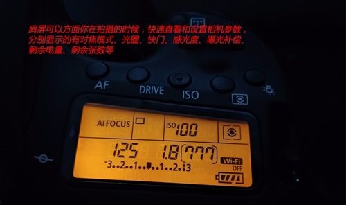 肩膀屏幕使您可以在拍摄时快速查看和设置相机参数,显示对焦模式,光圈,快门,感光度,曝光补偿,电池剩余电量,剩余帧数等.