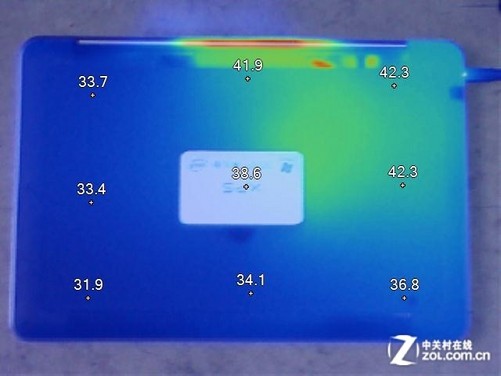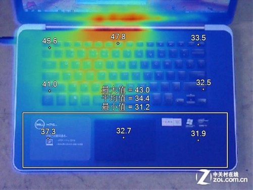 在表面温度方面,我们使用的温度检测设备来检测笔记本的散热性能. 为了便于我们观察整个机器的温度分布xps15散热怎么样,我们通过仪器检测获得温度分布图,记录并标记每个零件的温度. 根据温度分布图,机器的大部分热量积聚在左键盘区域,并且散热孔位于屏幕底部,掌垫和右键区域的热量较小,因此,掌托的温度在长期的实践经验中表现相对舒适. 因此,Dell XPS 15的温度分布仍然很好,但是散热端口的位置仍然有点热.