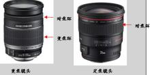 镜头的外观有明显差异. 定焦镜头只有一个对焦环(即控制清晰度,这将在后面描述),而变焦镜头有两个对焦环,即一个对焦环(控制清晰度)和变焦环(控制视角,即推拉).