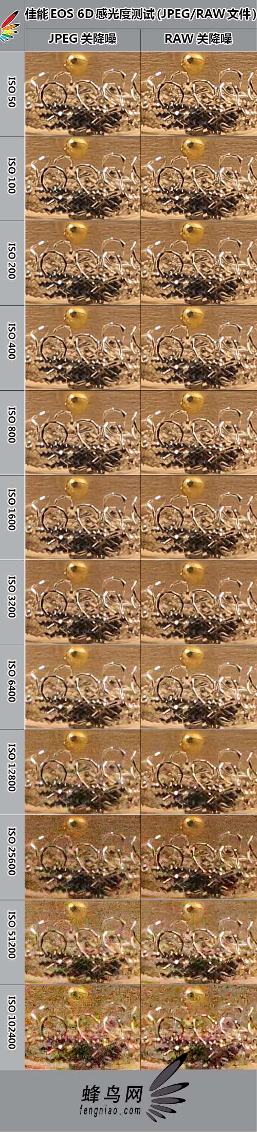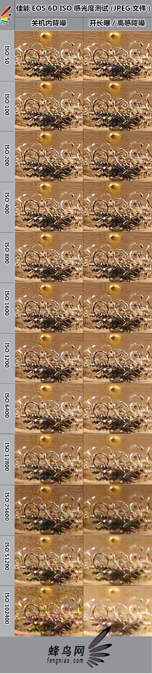 根据ISO测试结果,在未启用降噪功能的情况下6D表现良好. 开启降噪功能后,高感光度样张上的噪点将大大降低,但是图像的细节会丢失. (使用6D随机DPP软件将RAW文件转换为JPEG文件)