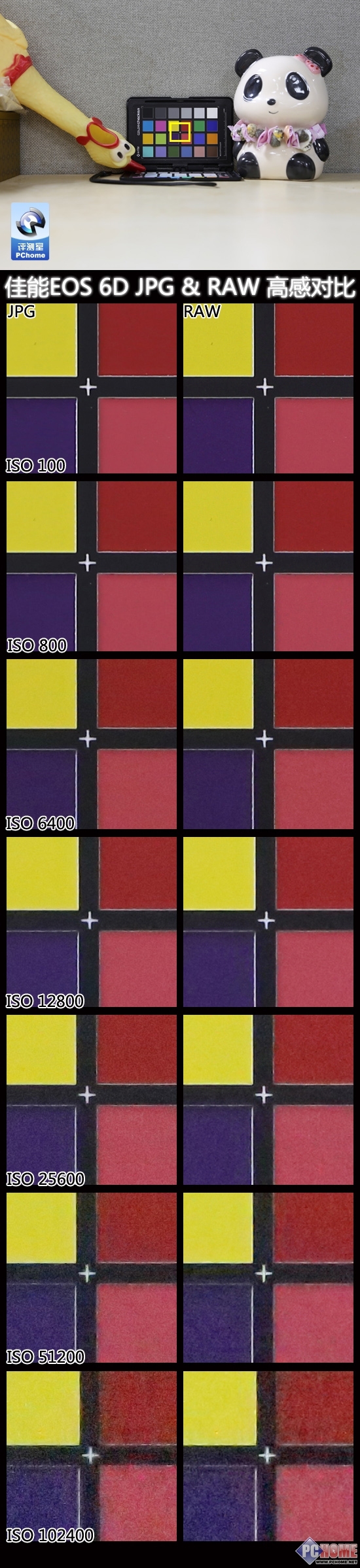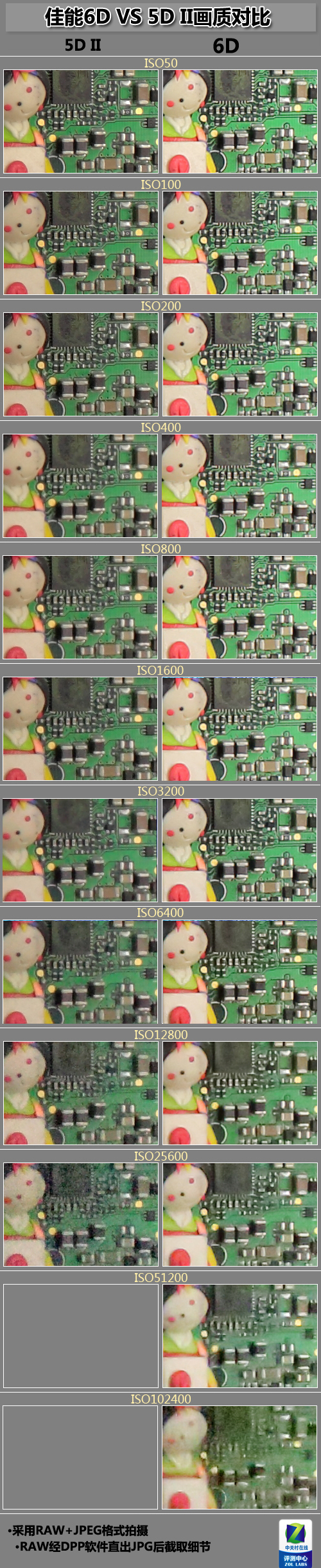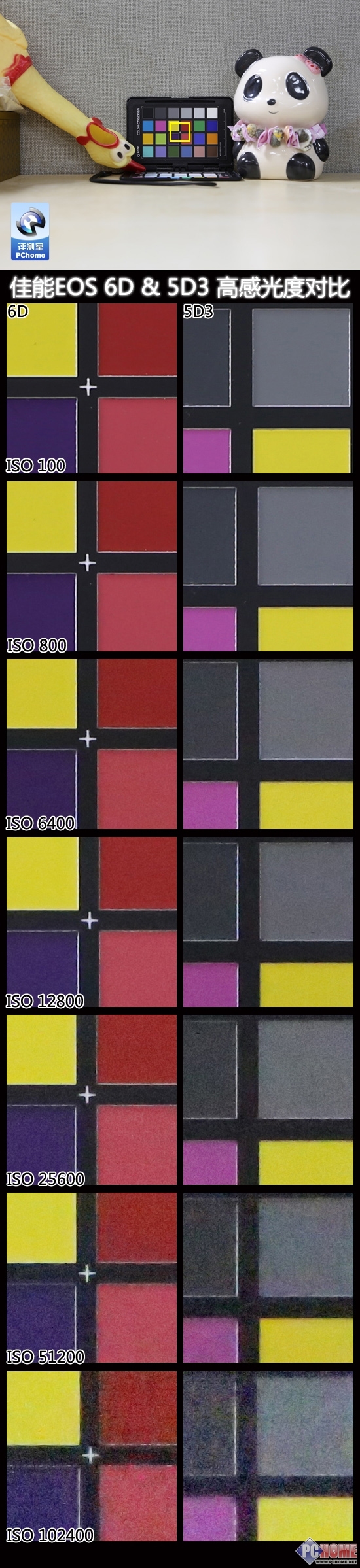 从分辨率方面看两款相机的性能之后,让我们看一下EOS 6D与无敌兔子在所有灵敏度水平下的真实拍摄性能.