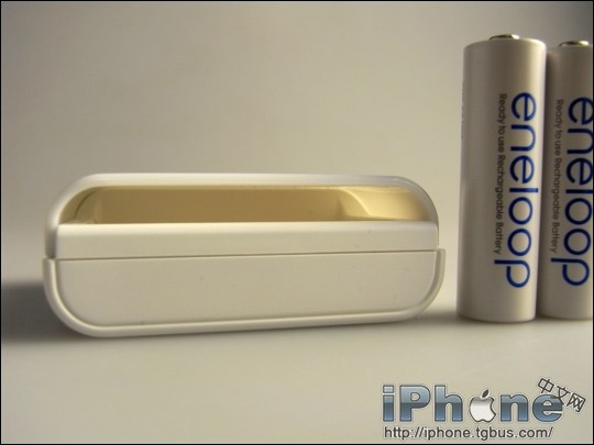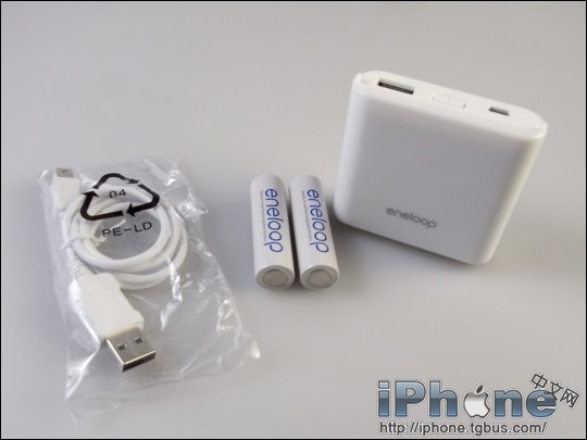 通过拆开塑封包装,取出内件,如上图所示。东西不多,就一个移动电源、两节5号eneloop电池、一根mini usb充电线。而iPhone用户可以直接用苹果充电器对移动电源充电!