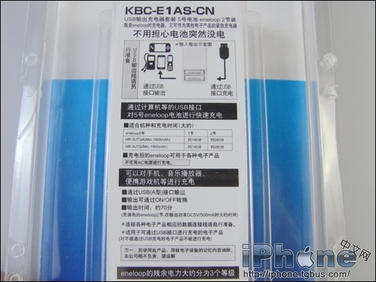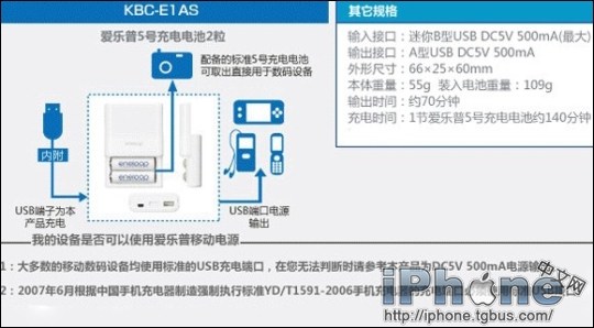 这款型号为KBC-E1AS的三洋爱乐普移动电源,能够通过USB方式实现电力的输出与输入。它采用了两节随赠的爱乐普充电电池供电,能够转换出约合锂电池1400毫安时的电量。而充电时间受限于电脑端USB接口的低电压,一节需要140分钟,两节需要280分钟。建议iPhone用户外接苹果充电器进行充电。