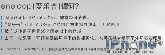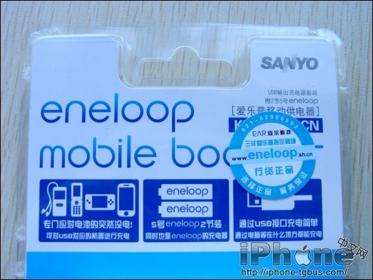 三洋eneloop充电电池分为5号和7号两种,产品采用了全新的分子材料和技术。能够循环充电1500次(普通充电电池约500次)。而且该电池能够在低温环境下使用(传统充电电池在零下3度就会损坏),不会出现传统5号电池在低温下“电压不足”的情况,从而保证了移动电源在低温环境下也能向iPhone源源不断输送电力。