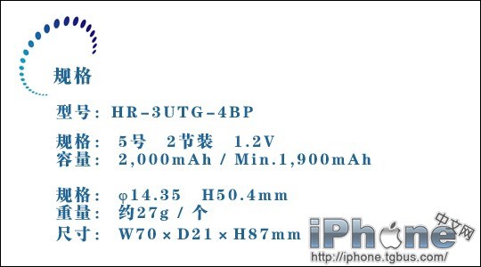 三洋移动电源随赠两节爱乐普5号“低自放电充电电池”,标注容量为2000mAh,实际容量下限为1900mAh。而5号电池和锂电池的容量则需要进行单位换算,4000mAh的爱乐普电池能够输出约为1500毫安时的电量,从而能够为iPhone一次性充满电量!另外每颗电池重约27g,移动电源重约55g,两节电池加上移动电源的总重量也才100g左右,外出使用具备良好的便携性。