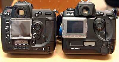 而机身背面的改进就比较大了。通过下图中尼康D2H(左)和尼康D1(右)机身背面的比较,我们可以看出尼康D2H的液晶显示屏和按钮布局有些类似尼康D100。在尼康D2H机身背面,按钮采用了大尺寸的圆形设计,操作起来非常的方便。此外,由于尼康D2H的取景器部分稍稍地往左偏移了一点,因此在拍摄时鼻子就不会总是碰到液晶显示屏的外罩了。