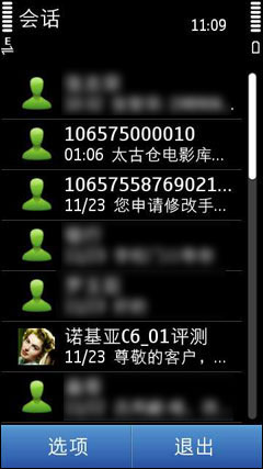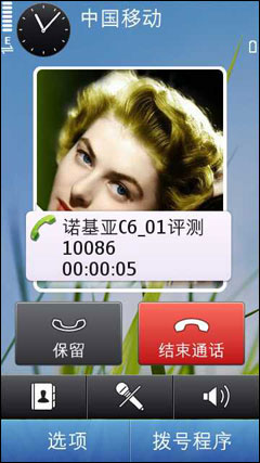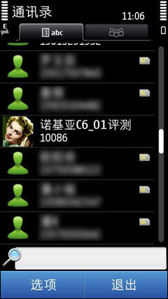 在基本通讯这一块,诺基亚C6-01强调操作上的简洁性。由于诺基亚C6-01是一部支持W/GSM两种网络的3G手机,所以也支持时下的视频通话。打开拨号界面,可以看到整个输入框异常的大,这也就造成虚拟的数字按键位置不够,有时会引起误操作。打开诺基亚C6-01的可以看到整个界面都非常简洁,不会让用户存在无从下手的情况,在联系人下方同时显示联系号码,这也省去了再点击查看详情的步骤。诺基亚C6-01的通话界面也简洁,操作方便的同时同时也兼具了美观性。
