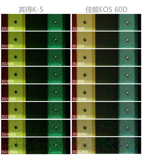 佳能EOS 60D从ISO1600开始出现轻微颗粒感,ISO3200下锐度有一定下降,并且出现极轻微细节损失。ISO6400下,样本在桌面尺寸下出现轻微噪点,细节部分损失明显,ISO12800纯色部分出现了不均匀的噪点分布,形成轻微色块。而K-5在ISO400下开始出现细腻的极轻微颗粒感,ISO800和ISO400几乎没有区别,只是颗粒感稍重,ISO1600时画面出现极轻微的细节和锐度损失,ISO3200下细节损失变得明显,但噪点几乎没有对锐度形成太大影响。ISO6400时,厚重的颗粒感对细节形成明显影响,暗部细节在100%察看时基本缺失。