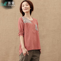 茵曼旗舰店2013秋装新款女装印花拼接棉麻圆领套头长袖衬衫女衬衣