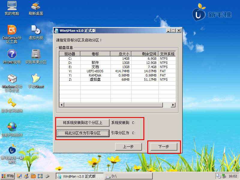 7. 接下来,使用鼠标单击硬盘分区作为安装系统分区和引导分区. 在这里,我选择C驱动器作为系统分区,然后单击“下一步”. 如下图所示: