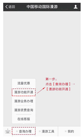 方法一: 使用[中国移动国际漫游]在微信公众号上申请自助服务,处理前请注意,并根据提示接收绑定到公众号的短信验证码中国移动香港漫游上网,然后可以申请开放国际漫游功能. 示例如下: <