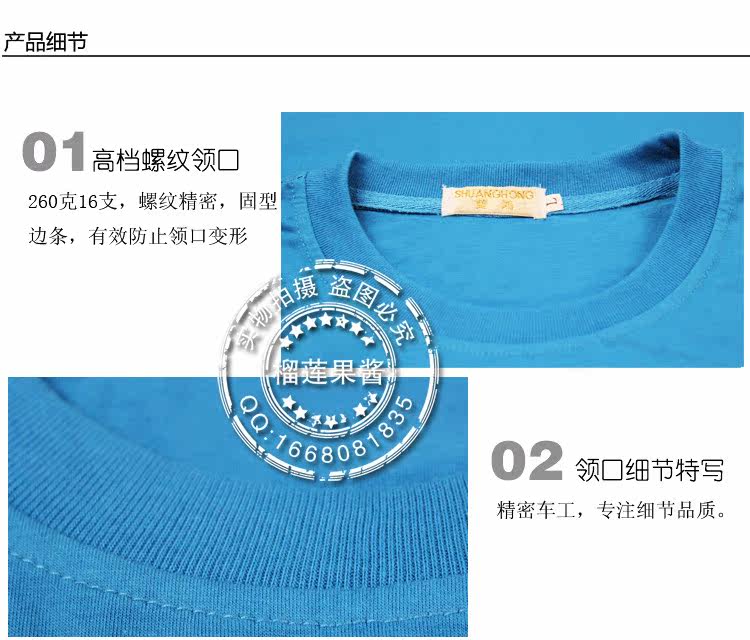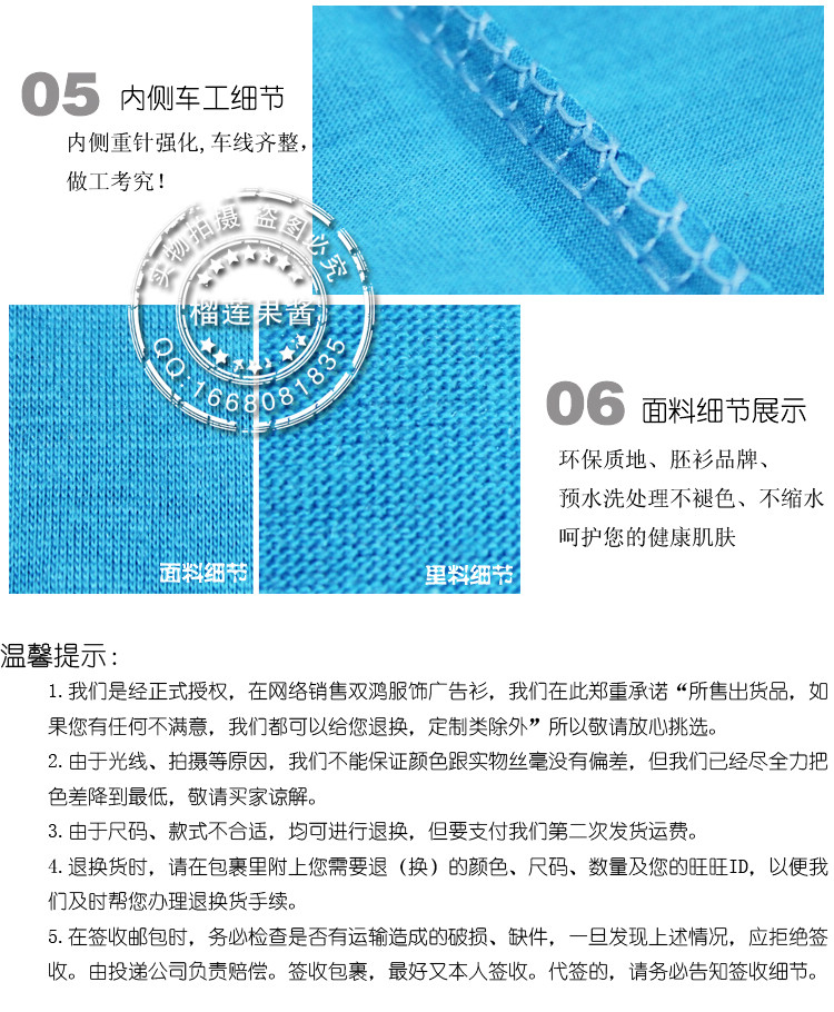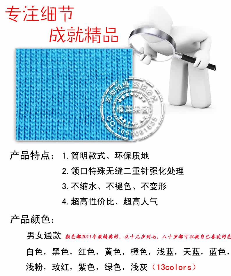【特点】重磅精梳,预水洗免烫处理,不变形,不褪色,先进环保的活性染色工艺,无污染,保证了衣物颜色的纯正和固色性能!