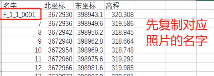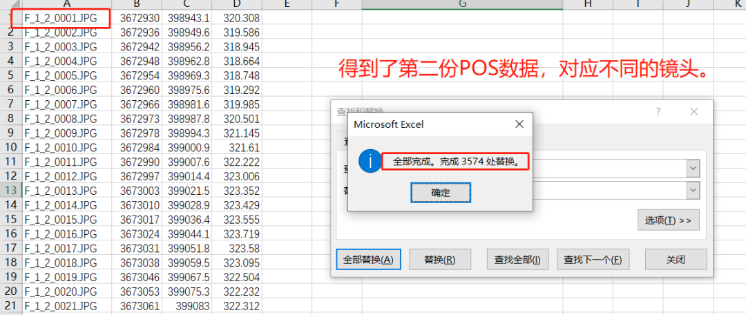 如果是五个镜头,则需要制作5份POS数据副本,然后将每个POS数据导入到excel中. 根据照片名称修改POS名称,使其一一对应,最后删除标题行.