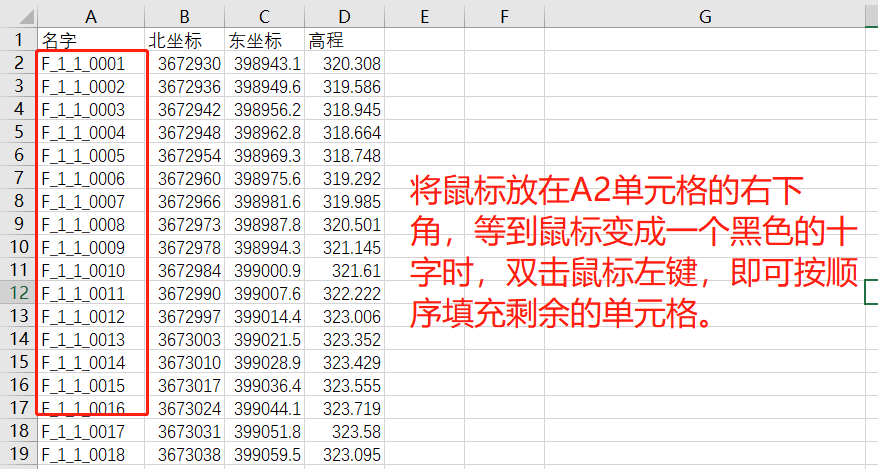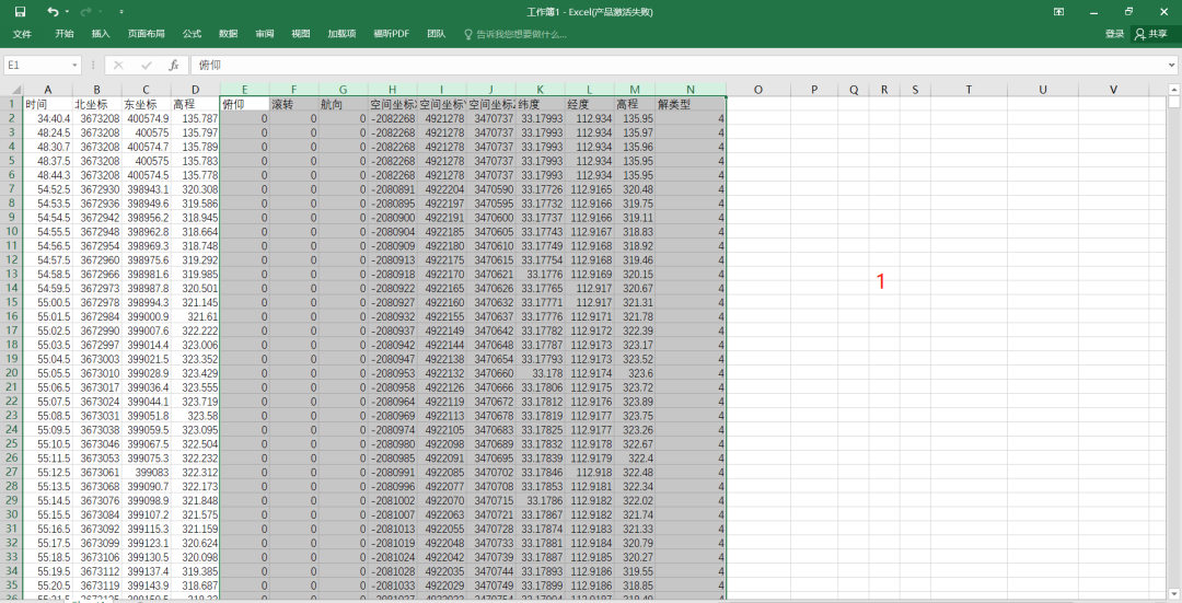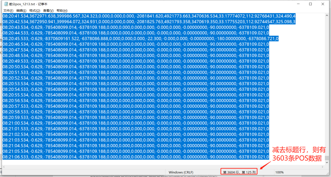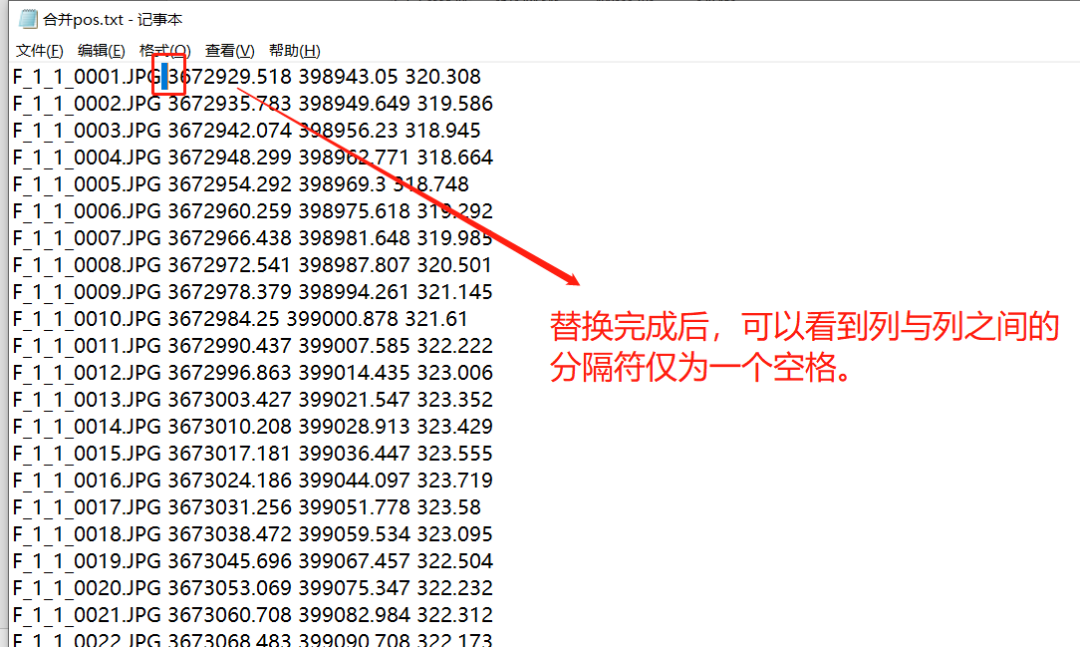 差异后POS文件通常只需要保留北,东(或纬度,经度)和高程值的三列. 其他数据可以删除. 如果遇到坐标异常的数据(通常飞行员会注意),则删除相应的异常信息,并同时删除与异常数据对应的照片.