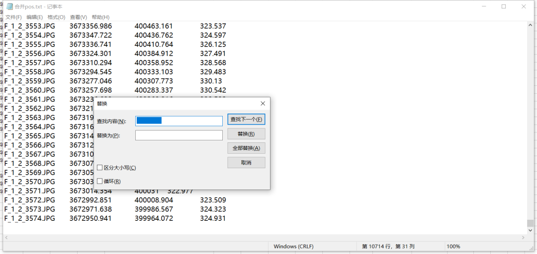 2)然后,我们使用“替换”功能将一个空格替换为多个空格. 替换完成后,保存并获取最终处理的POS数据.