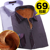 冬装新款男装加厚加绒衬衫中年条纹保暖白色休闲男士衬衣长袖加棉