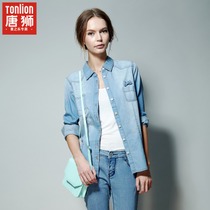 唐狮2014春装新品 女蝴蝶结装饰长袖牛仔衬衫 女装修身中长款衬衣