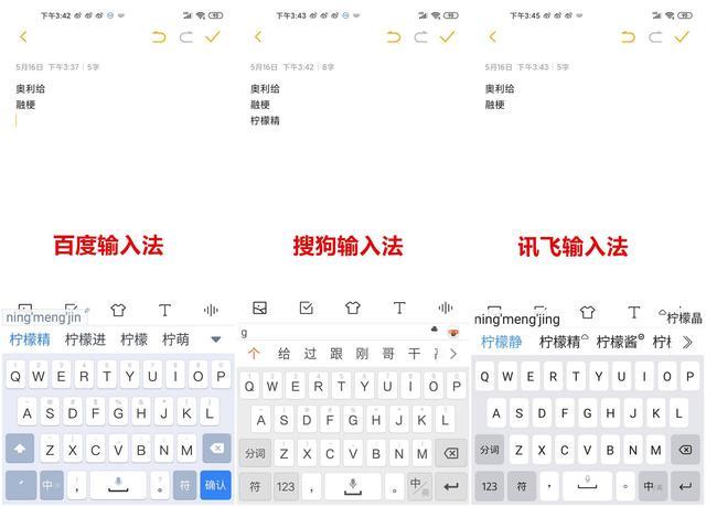 测试结果: 所有三种输入法都可以正确识别这三个最新的流行词. 但是,在识别速度方面,百度和搜狗输入法都可以在第一个选项中给出该单词,而iFLYTEK必须在云单词中显示正确的答案,这稍差一些,但是总体体验还是可以的.