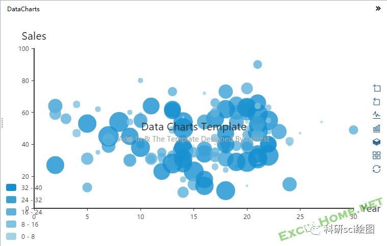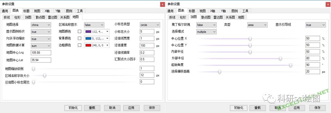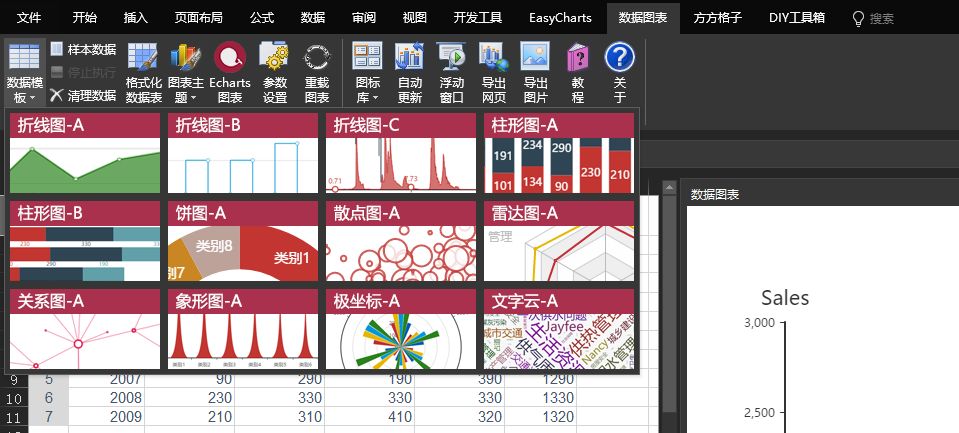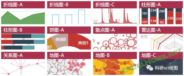 数据图表中包含的数据模板的类型非常丰富. 除了常见的折线图,饼图和柱形图;内置了更多高端散点图,关系图,极坐标图甚至词云...