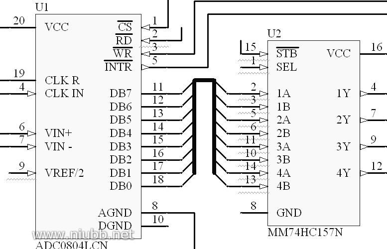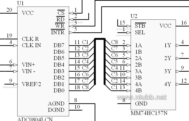 按照以上绘制方法完成图1.2.47中元件U1和U2之间总线和总线分支的绘制。完成后效果如图1.2.49所示。