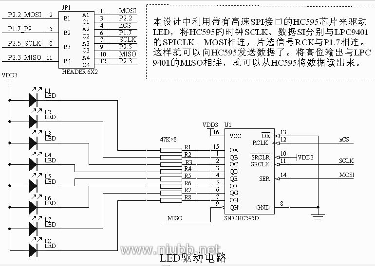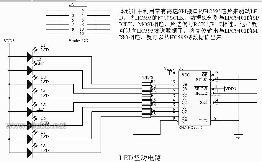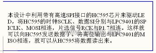 参照图1.2.57,在图中添加如下文字注释:“LED驱动电路”、“47K×8”、“本设计中利用带有高速SPI接口的HC595芯片来驱动LED,将HC595的时钟SCLK、数据SI分别与LPC9401的SPICLK、MOSI相连,片选信号RCK与P1.7相连。这样就可以向HC595发送数据了。将高位输出与LPC9401的MISO相连,就可以从HC595将数据读出来”。添加注释后的效果如图1.2.75。