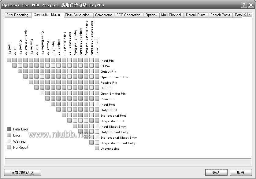 假如用户希望当进行电气规则检查时,对于元件无源引脚未连接时,系统不产生报告信息。则可以在矩阵的右侧找到passive pin(无源引脚),然后再在矩阵上部找到unconnnected(未连接)这一列,持续单击两行列相交处的小方块颜色,直到其变为绿色(不报告),就可以改变电气连接检查后的报告类型)。