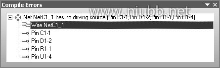 执行菜单“项目管理”/“编译PCB Project 实用门铃电路”,系统会弹出如图1.2.101所示的消息(Message)提示框,提示项目中存在的问题。如果没有出现提示框,则单击位于屏幕右小角的System标签,在弹出的选项中选择Message标签,可以打开Message对话框。