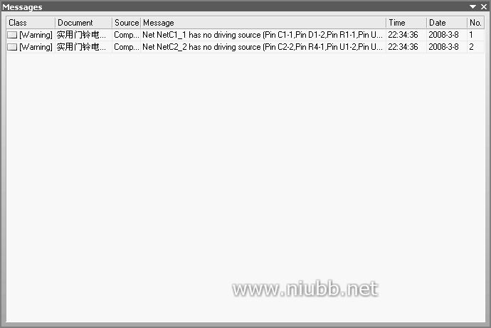 再次行菜单“项目管理”/“编译PCB Project 实用门铃电路”,编译后打开消息提示框,发现已无任何提示信息,表示编译无错。