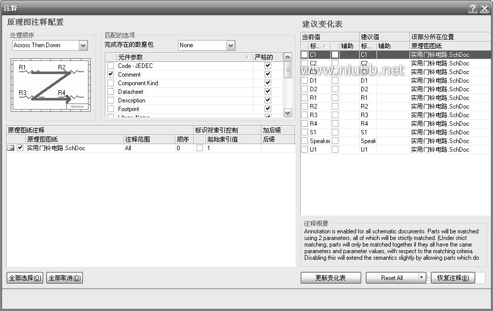对于复杂电路,如果元件很多,则编号很容易混乱。如果采用手工修改,不但浪费时间,还很容易出错。而Protel DXP 2004提供了元件编号管理功能。可以对序号自动按照一定的规则重新排列。“实用门铃电路”称不上是一个复杂电路。在此,我们以它为例,具体介绍元件序号重新编号功能。