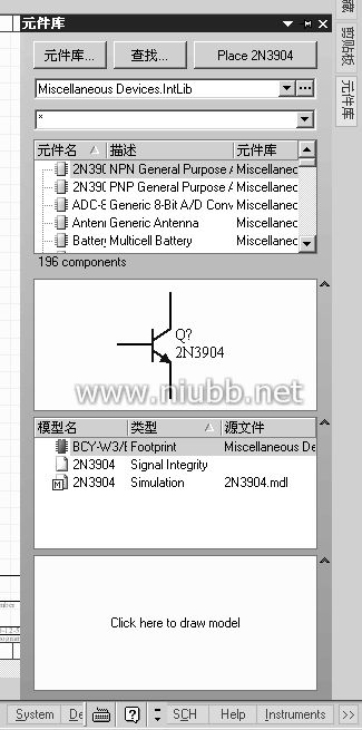 (2)单击Protel DXP 2004窗口右侧的标签项“元件库”,打开“元件库”面板,如图1.2.7所示。该面板也可以通过菜单“查——文章窝——看”/“工作区面板”/“System”/“元件库”打开或关闭。