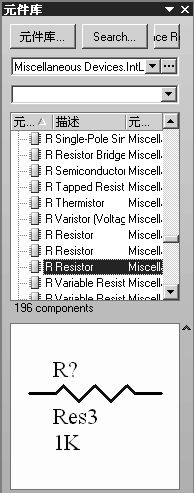 (3) 从元件库面板上方的库列表下拉菜单中选择Miscellaneous Devices.Intlib,使之成为当前元件库,同时该库中的所有元件显示在其下方的列表项中。从元件列表中找到电阻RES3,单击选择电阻后,电阻将显示在面板的下方。如图1.2.8所示。
