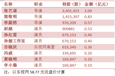 值得注意的是,以乐视网收盘价58元计算,本次收购乐视影业股权,张艺谋持股市值达到了2亿元,郭敬明持股市值超8000万元,孙红雷持股4000万。乐视网张艺谋