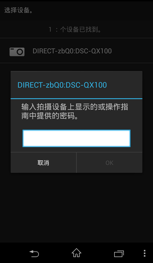 按下索尼QX100的电源键,然后在智能手机上打开WiFi功能,接着进入PlayMemories Mobile应用程序,变会出现以上输入WiFi密码的画面。