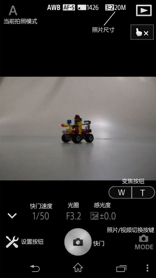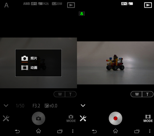 在PlayMemories Mobile应用程序的主界面中我们可以看到,通过这个应用程序我们可以进行很多操作。比如可以使用这个应用程序控制镜头变焦,或者在照片和视频两个模式之前切换。而且在对焦的时候就像使用手机拍照一样,通过这个显示屏可以进行全屏触控对焦。